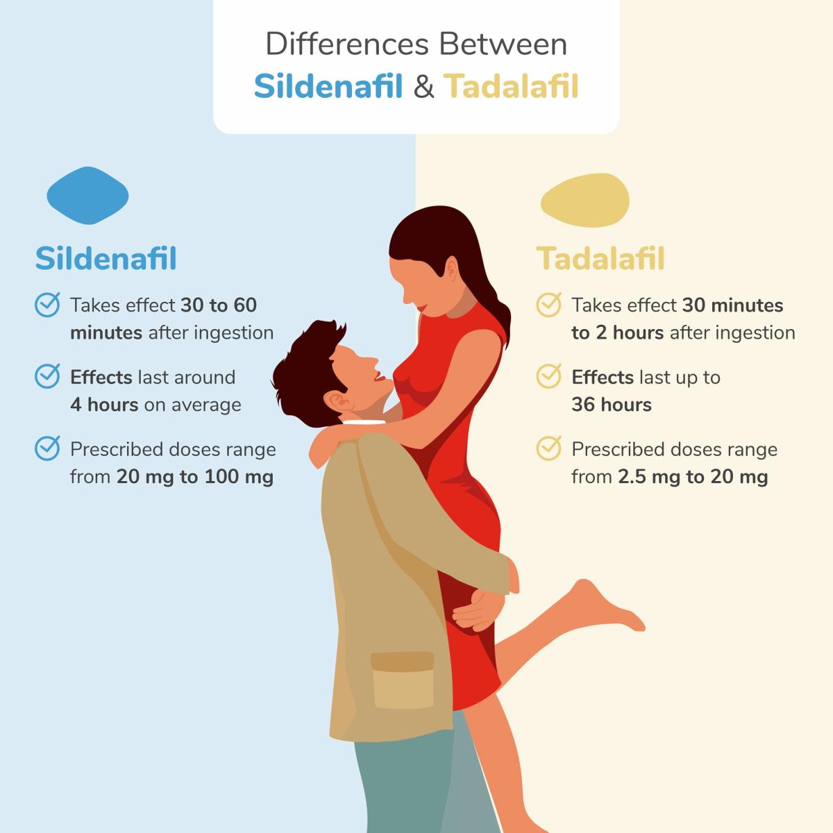 Sildenafil is more often recommended for spontaneous use. It takes about 30 minutes to take effect and lasts around five hours. While for some users, the effects can start as soon as 30 minutes. However, recommended advice is to allow tadalafil approximately two hours before sexual activity for best results. Tadalafil effects can last up to 36 hours after ingestion making it suited for long-term use.12